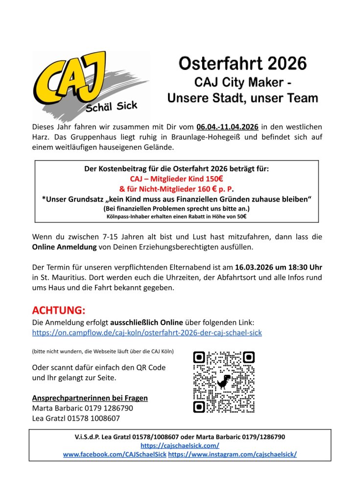 Veröffentlicht am Januar 16, 2023Februar 21, 2026 von CAJ Schäl Sickkommende Aktionen Stuntwerk Mülheim Anmeldung: https://on.campflow.de/caj-koln/stuntwert-07-03 Osterfahrt 2026 Jahresplaner 2026 Jahresplan 2026Herunterladen TweetMehr Einen Link per E-Mail an einen Freund senden (Wird in neuem Fenster geöffnet) E-Mail