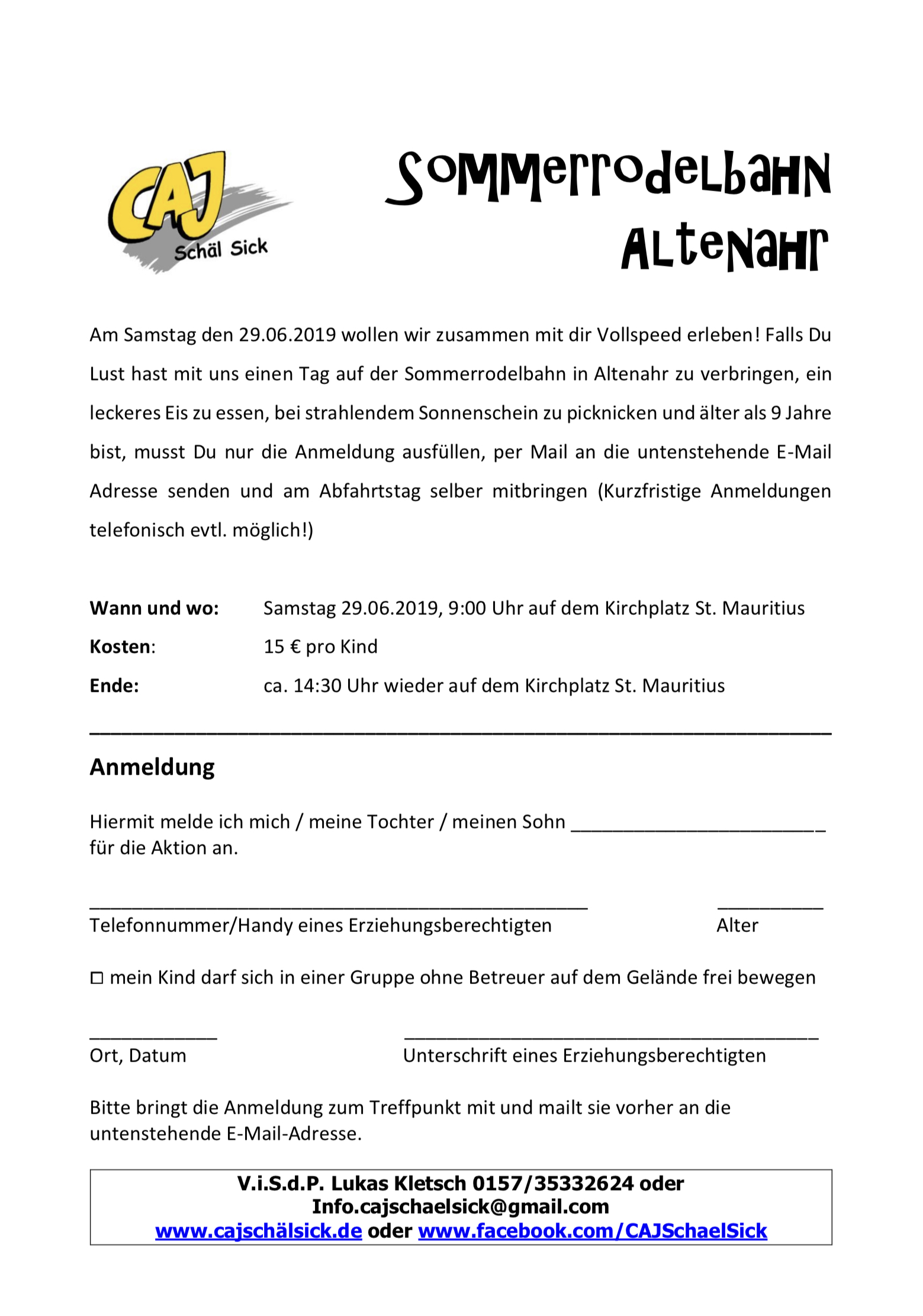 Am Samstag den 29.06.2019 wollen wir zusammen mit dir Vollspeed erleben! Falls Du Lust hast mit uns einen Tag auf der Sommerrodelbahn in Altenahr zu verbringen, ein leckeres Eis zu essen, bei strahlendem Sonnenschein zu picknicken und älter als 9 Jahre bist, musst Du nur die Anmeldung ausfüllen, per Mail an die untenstehende E-Mail Adresse senden und am Abfahrtstag selber mitbringen (Kurzfristige Anmeldungen telefonisch evtl. möglich!)